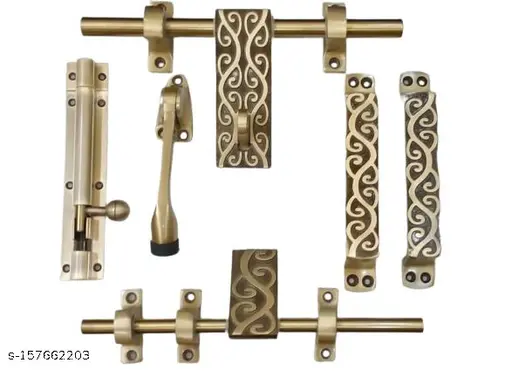 1. Name : Antique Door Fittings Kit, Door Accessories Kit, Door Kit Set (1 Aldrop 10 Inches, 1 Latch, 2 Handles, 1 Tower Bolt and 1 Door Stopper, Finish : Antique Brass) Aluminium Door Handle (Gold Pack of 1)
